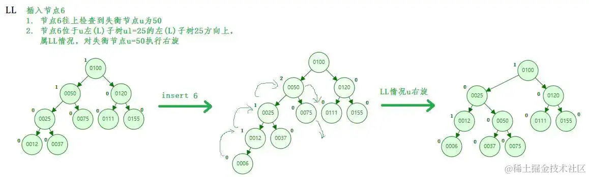 - 右旋转:用于平衡LL情况,对失衡节点u及子树进行右旋
