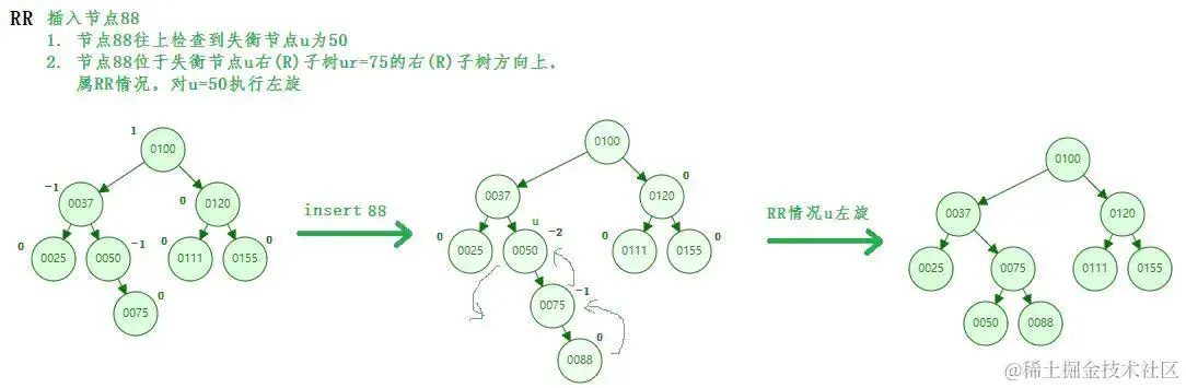 - 左旋转:用于平衡RR情况,对失衡节点u(unbalanced)及子树进行左旋