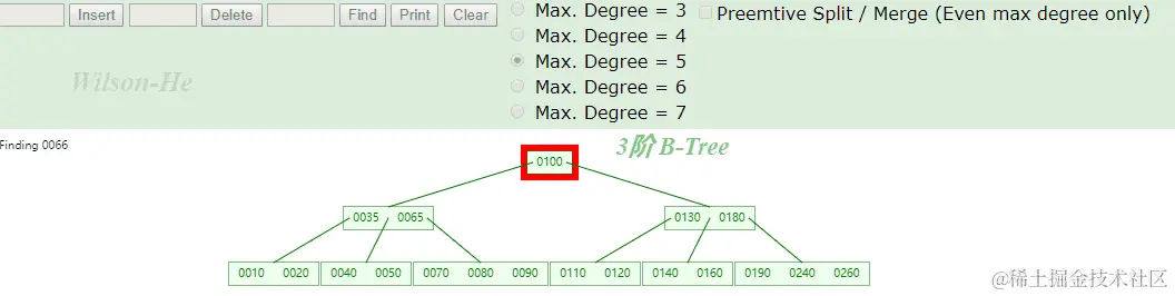 - 检查搜索值是大于还是小于当前key值 搜索值小于当前key:左子树中获取第一个key进行比较,重复2、3步骤 搜索值大于当前key:将搜索值与同一节点中的下一个key进行比较,重复2、3步骤,直到精确匹配,或搜索值与叶子节点中的最后一个key值相比较