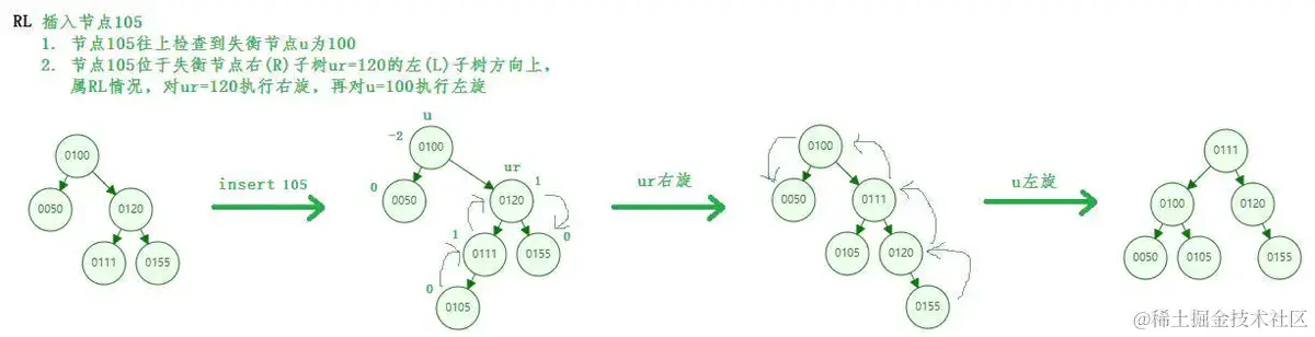 - 右左旋转:用于平衡情况,对失衡节点u失衡方向的右子节点ur右旋,再对失衡节点u左旋