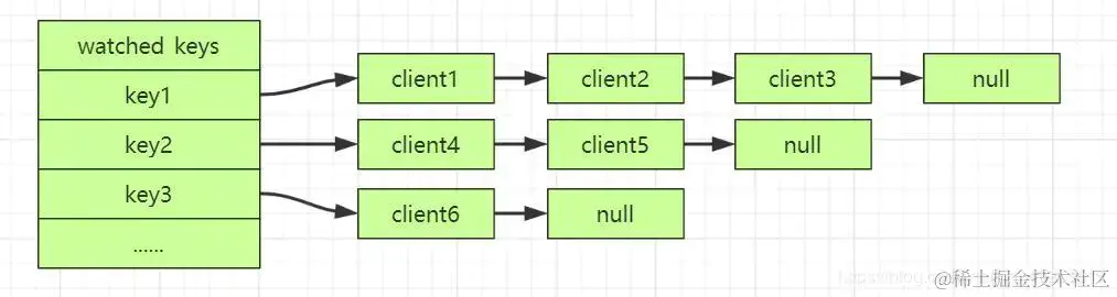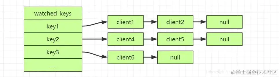 WATCH命令的底层实现中保存了watched_keys 字典,「字典的键保存的是监视的key,值是一个链表,链表中的每个节点值保存的是监视该key的客户端」。