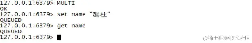 redis> MULTIOKredis> SET name "黎杜"QUEUEDredis> GET nameQUEUED