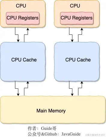 - 初始时,两个线程分别读取i的值,存入各自所在的CPU高速缓存中。