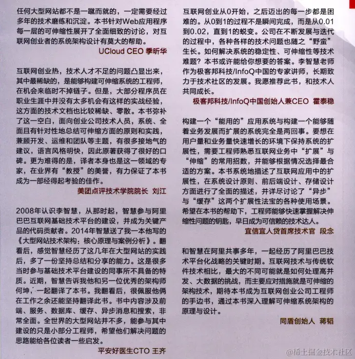 希望本文可以成为开启读者可伸缩架构设计之旅的一个里程碑。文中既给出了可伸缩架构设计的整体概览视图,同时也深入探讨了一些重要的技术点并给出了一些最佳实践建议。然而,文中并没有对每一个技术细节都深人阐述,而是尽可能地为读者呈现那些必要的概念、基本的规则,以及有意义的实例。