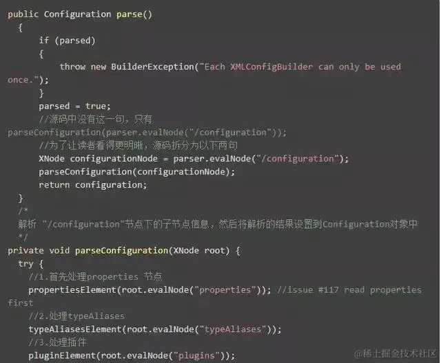 接着上述的 MyBatis初始化基本过程讨论,当SqlSessionFactoryBuilder执行build()方法,调用了XMLConfigBuilder的parse()方法,然后返回了Configuration对象。那么parse()方法是如何处理XML文件,生成Configuration对象的呢?