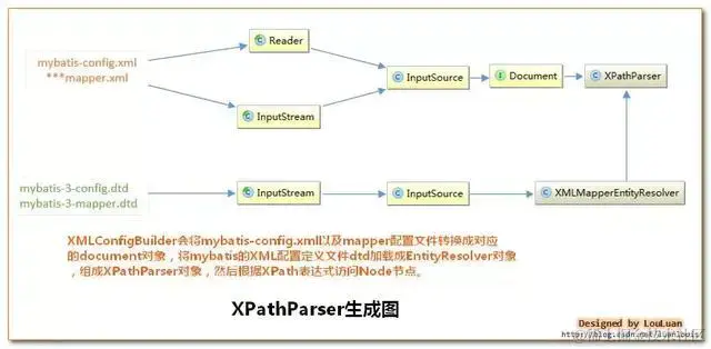 1. XMLConfigBuilder会将XML配置文件的信息转换为Document对象,而XML配置定义文件DTD转换成XMLMapperEntityResolver对象,然后将二者封装到XpathParser对象中,XpathParser的作用是提供根据Xpath表达式获取基本的DOM节点Node信息的操作。如下图所示: