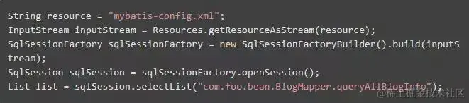 有过MyBatis使用经验的读者会知道,上述语句的作用是执行com.foo.bean.BlogMapper.queryAllBlogInfo 定义的SQL语句,返回一个List结果集。总的来说,上述代码经历了mybatis初始化 -->创建SqlSession -->执行SQL语句 返回结果三个过程。
