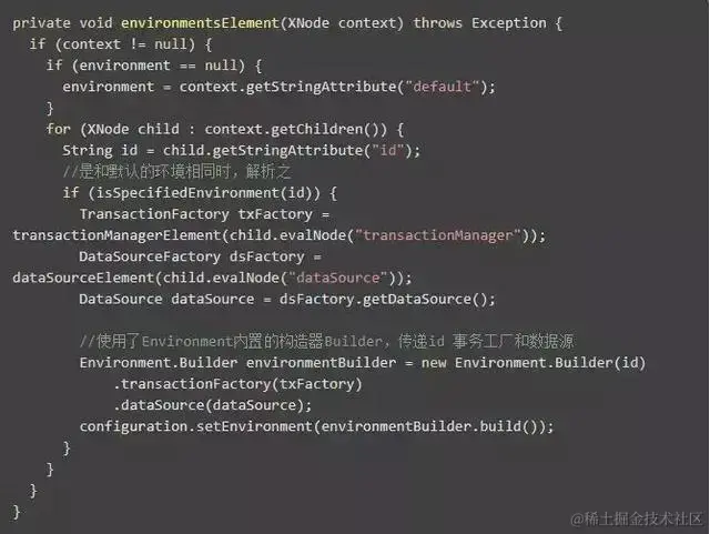 解析子节点的过程这里就不一一介绍了,用户可以参照MyBatis源码仔细揣摩,我们就看上述的environmentsElement(root.evalNode("environments")); 方法是如何将environments的信息解析出来,设置到Configuration对象中的: