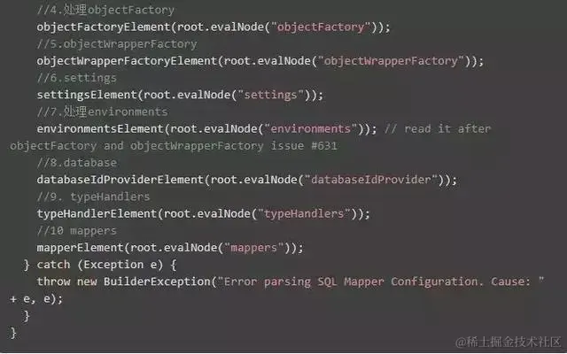 注意:在上述代码中,还有一个非常重要的地方,就是解析XML配置文件子节点<mappers>的方法mapperElements(root.evalNode("mappers")), 它将解析我们配置的Mapper.xml配置文件,Mapper配置文件可以说是MyBatis的核心,MyBatis的特性和理念都体现在此Mapper的配置和设计上,我们将在后续的文章中讨论它,敬请期待~