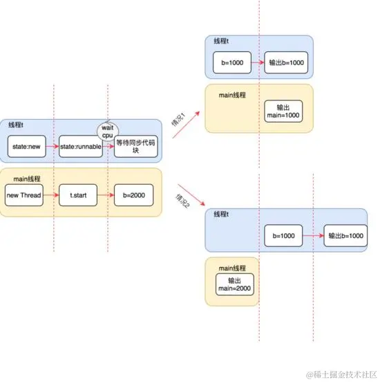 情况B:有可能t还没执行,tt.m2()一执行完,他刚好就执行,这个时候还是有两种情况。b=2000或者1000