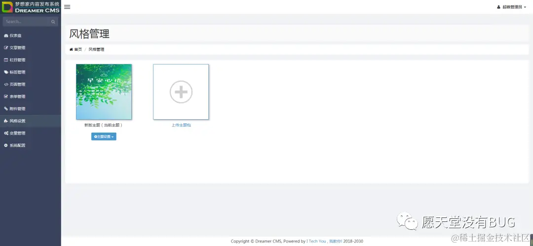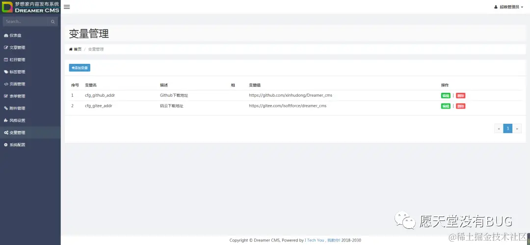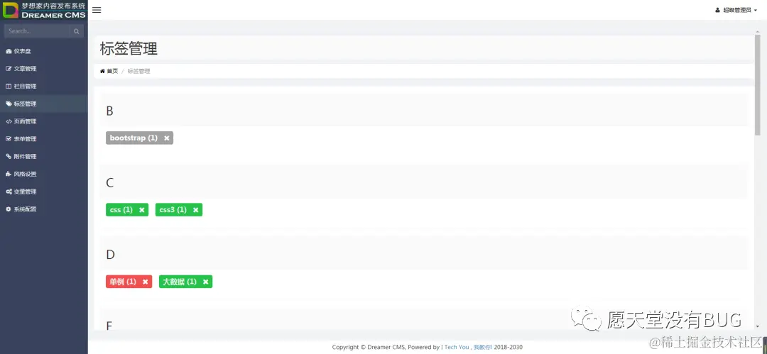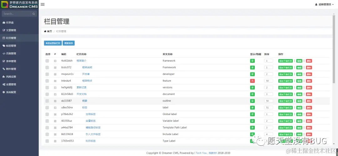 DreamerCMS(梦想家CMS内容管理系统)公开解决了快速搭建展示型网站(如:企业官网、技术博客、信息门户等)的框架体系,是电子政务、电信综合门户、企业信息门户、知识管理平台、电子商务平台的基础性软件系统。可以帮助政府、企业或组织灵活、准确、高效、智能地管理信息内容,实现信息的采集、加工、审核、发布、存储、检索、统计、分析、 反馈等整个信息生命周期的管理。采用时下最流行的Springboot+thymeleaf框架搭建,具有灵活小巧,配置简单,标签化模版,快速开发等特点。主要解决公司搭建网站成本高、投入大、周期长等问题,也可作为初创公司很好的基础技术框架。使用过程中不需要专业的后端技术开发技能,只要使用系统提供的模版标签,即可轻轻松松建设网站。