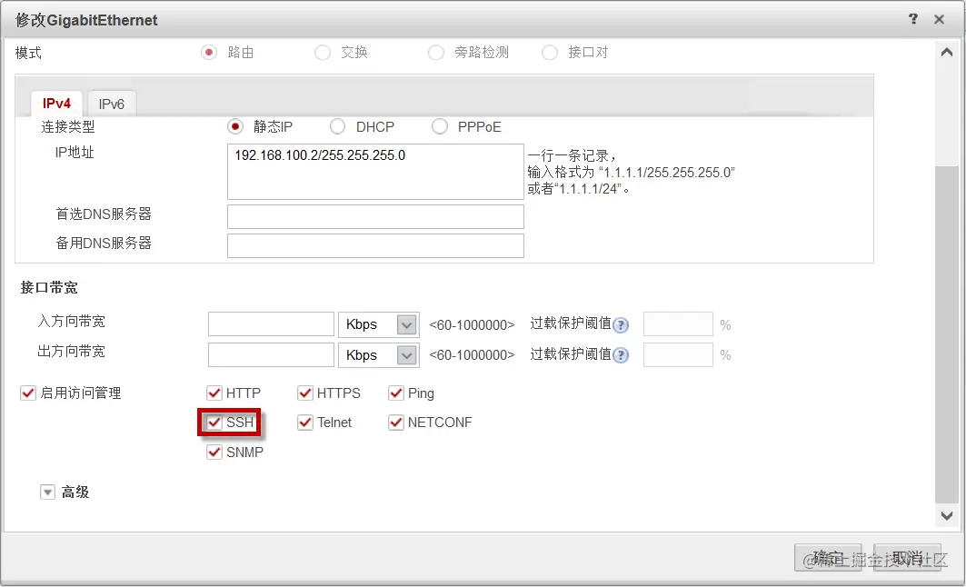 [FW1-GigabitEthernet0/0/0]service-manage stelnet permit //使用SSH认证