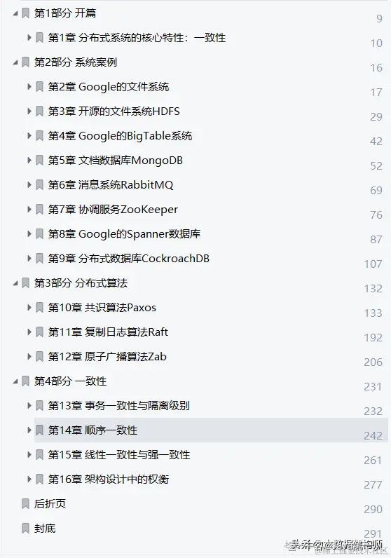 本文总共分为四大部分:开篇、系统案例、分布式算法、一致性;同时又把这四大部分化为16个章节,这16个章节里面又有更加细化的内容相信大家已经从上面的目录中可以看到!