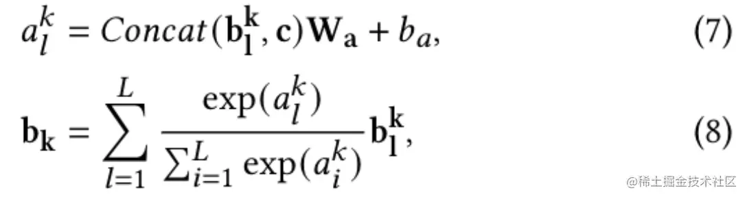 第个位置行为序列的聚合表示可以通过注意力机制获取,如以下公式所示: