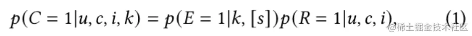上述的方法通常基于一个较强的假设,即点击伯努利变量依赖于两个潜在的伯努利变量E和,如下式所示: