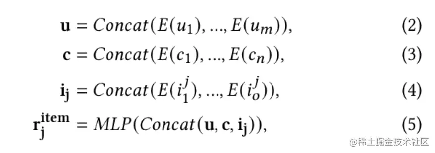 其中,,分别是当前用户特征集合、当前上下文特征集合以及第个广告的特征集合,是Embedding映射。