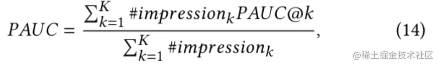 其中,是第个位置的曝光数量,是第个位置曝光数据的AUC。PAUC指标衡量每个位置上相关性排序的质量,忽略了位置偏差对排序质量的影响。