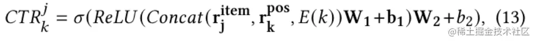 位置组合模块的目的是去组合个广告和个位置来预估每个广告在每个位置上的CTR,我们采用一层非线性全连接层来学习广告、位置、上下文和用户的非线性表示,第个广告在第个位置上的CTR可以由如下公式得出: