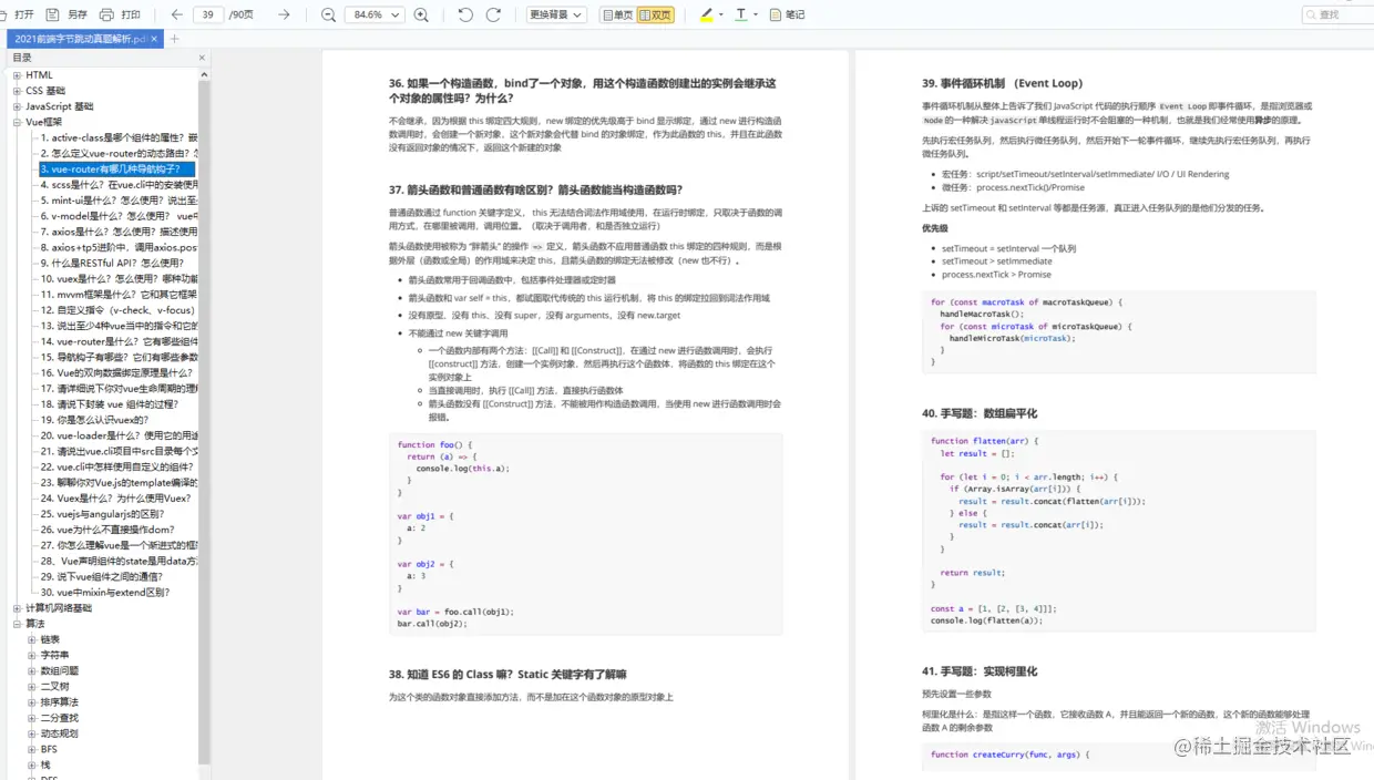 内容包括html,css,JavaScript,ES6,计算机网络,浏览器,工程化,模块化,Node.js,框架,数据结构,性能优化,项目等等。(本文资料 适合0-2年)