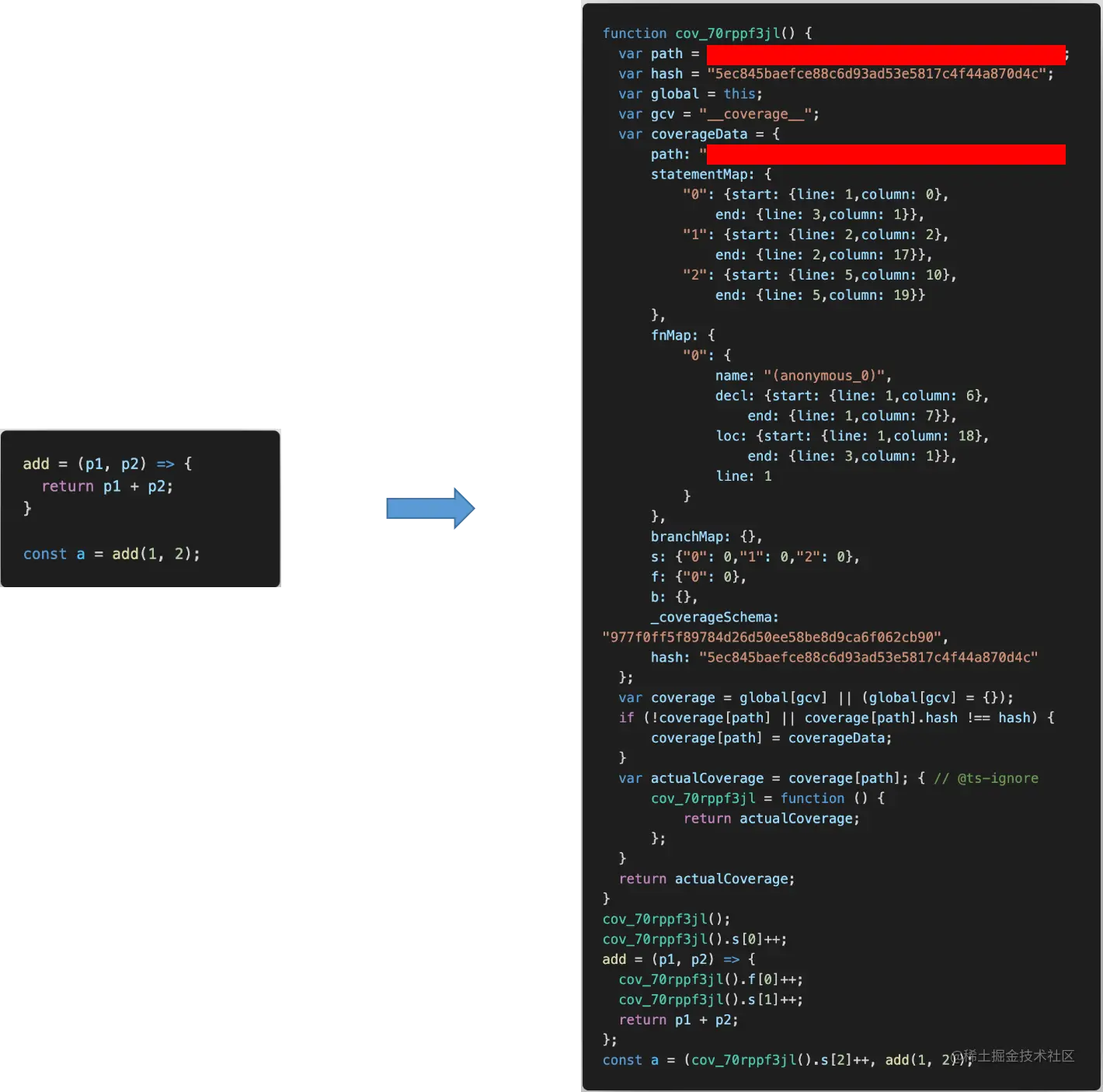使用nyc插桩,插桩后代码与原代码相比,有如下两部分变化: