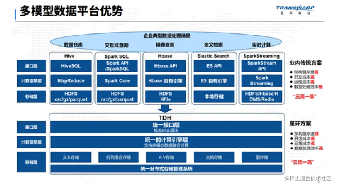 多模型大数据平台,与传统开源方案相比,架构复杂度低、开发成本低、运维成本低、数据处理效率高。