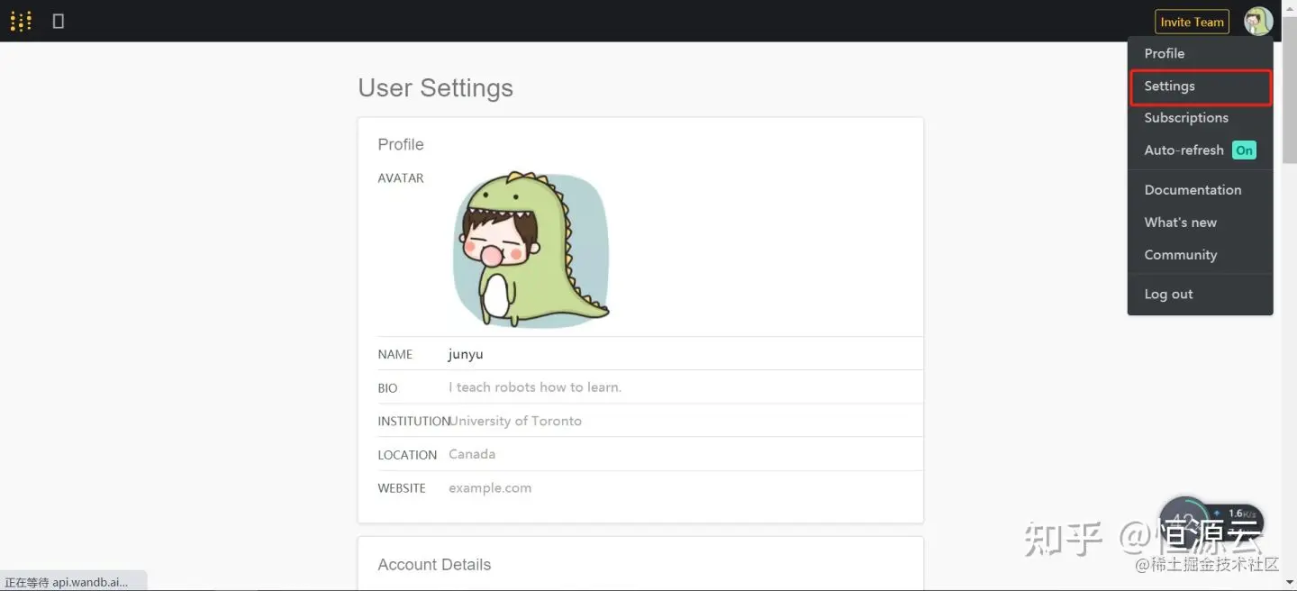 (2)点击头像下的Settings,寻找api key