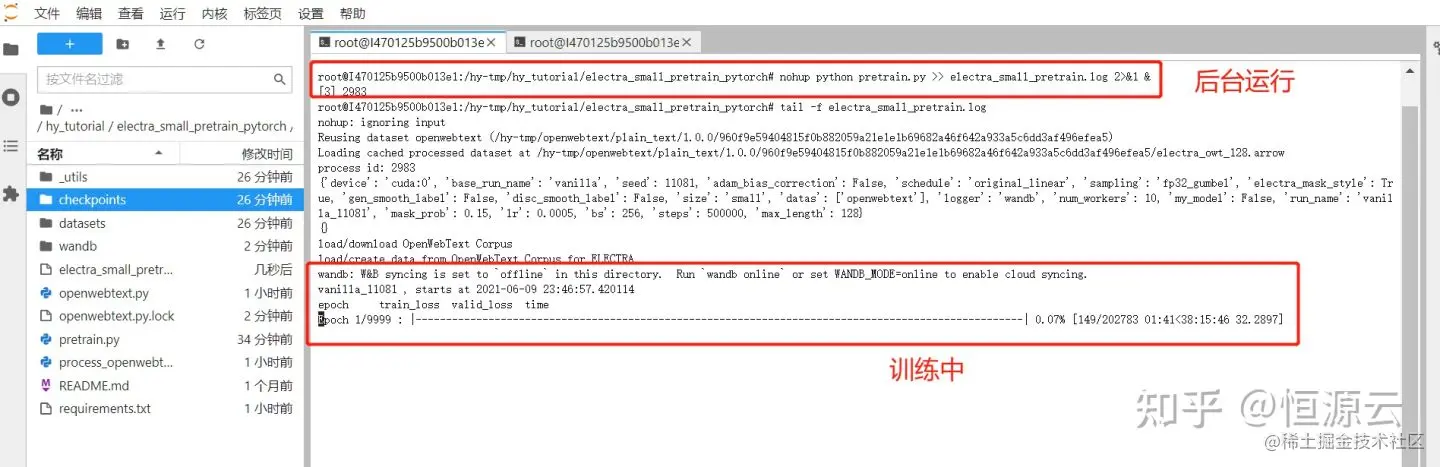 nohup python pretrain.py >> electra_small_pretrain.log 2>&1 &