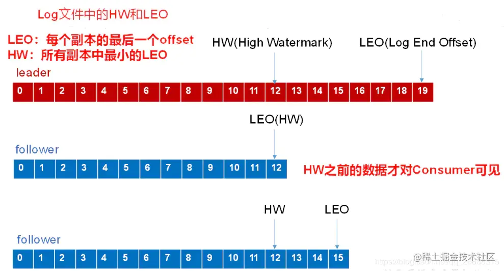 - HW——High Watermark::指的是消费者能见到的最大的 offset,ISR 队列中最小的 LEO。