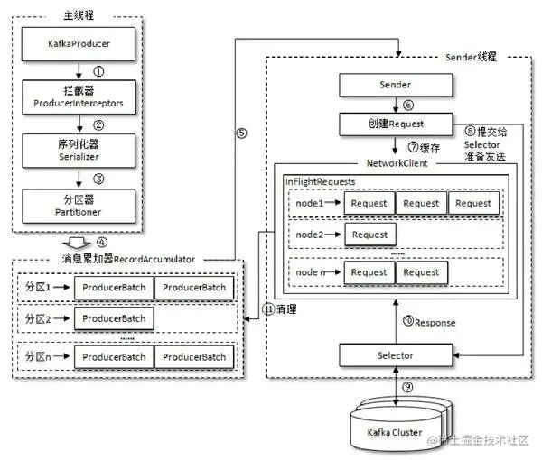 主线程:负责消息创建,拦截器,序列化器,分区器等操作,并将消息追加到消息收集器RecorderAccumulator中(这里可以看出拦截器确实在序列化和分区之前执行)。