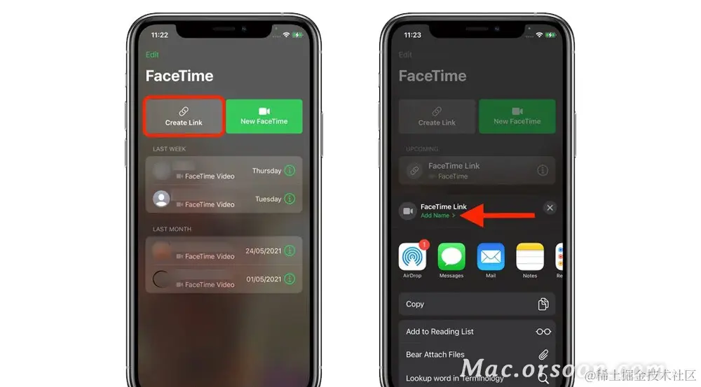 3.通过点击出现的“操作”菜单顶部的“添加名称”,为您的“FaceTime”链接指定一个可识别的名称。
