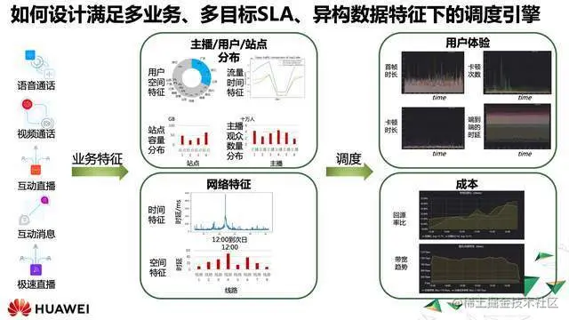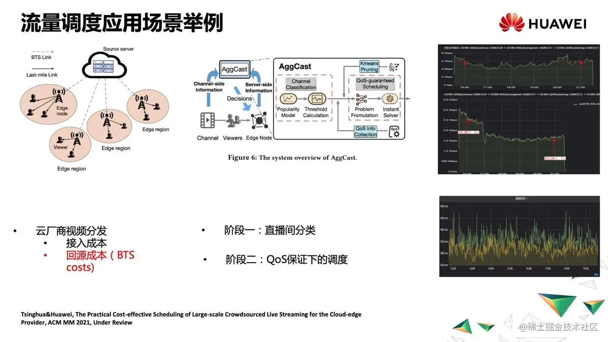 整个视频的成本来自两个部分,接入成本和回源成本(BTS Costs)。回源降低成本的核心难点是在QoS保障的情况下实现不同特征的流的调度。华为和清华大学一起提出了Aggcast架构来解决该问题。右图是上线后的效果。带宽回源成本降低了30%,同时体验也是更好的状态。