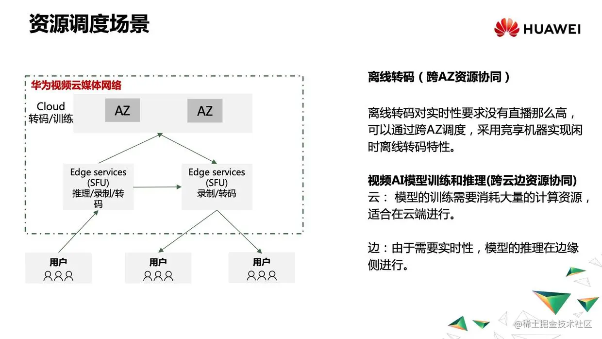 资源调度主要指计算资源的调度,在视频云的场景下会遇到很多类似例子,比如离线转码业务希望能用更便宜的资源进行大规模离线转码,可以通过跨AZ调度,采用竞享机器进行离线转码;视频AI模型训练和推理时,会有跨云边资源协同,这需要调度能够跨云边进行调度。