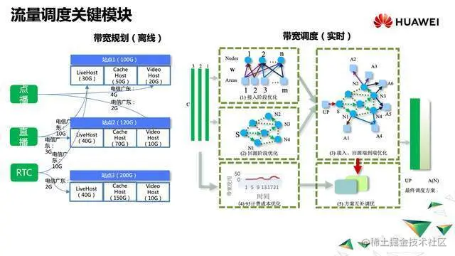在这个环节,我们其实做了个数学抽象,我们认真研究了不同业务下的问题的特性,不管是直播、RTC还是点播,从数学问题抽象来讲是类似的。可能业务的同学感觉到问题是不一样的,但从数学描述上是一样的,只不过是约束不一样。比如,RTC和直播的区别在哪,RTC的约数就是200毫秒的时延,但直播可以允许是400毫秒,从数学上本质是一样的。所以之前看到同行做了三张网没有协同,这其实是一个非常大的资源浪费,华为云在做的是实现整个资源上的协同,不管点播、直播、RTC,我们在同站点、同带宽上实现了资源环节上的协同。这才能保证在极致的体验下,给客户更低的成本。