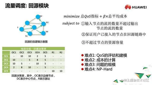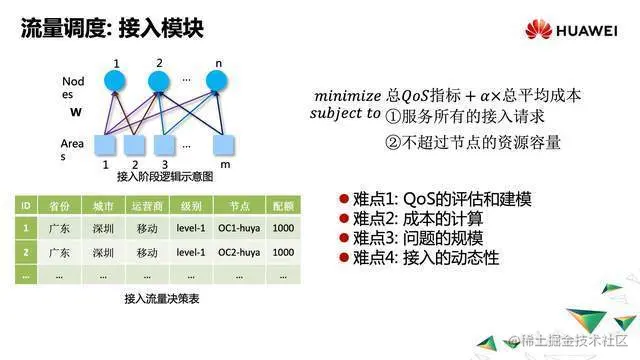 接入环节其实是指派问题的变形版,工程上最简单的办法是做就近接入,缺点是也许可以保证一个区域的时延,但不能保证另一个区域的时延,这是组合优化的问题。华为联合香港大学数学系一起对这块做了系统研究,取得了较好的效果,最终能够在全网环境下快速求解。这个问题的难度受几个点影响,比如Areas的1号节点想要接入Nodes的1号、2号、3号......N号节点(上图),历史数据可能有显示接入1号、2号节点的、但没有显示接入N号节点的。这时的做法应该是首先在稀疏数据额下做精准的Qos预测。总体来说,华为在这个问题上有了更好的思路并且已经基本攻克,但是规模还比较小,我们认为这是视频的根技术,或者说核心问题。