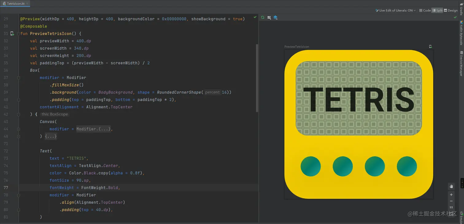 本游戏的 icon 就是通过这种方式来生成的。可以看到 PreviewTetrisIcon() 函数并不包含返回值,当然这种情况下也不需要入参参数。此外,Compose 的一个优点就是所见即所得,通过添加 @Preview 注解就可以预览实现效果,每次修改过后无需编译,只要刷新一下就可以看到修改结果