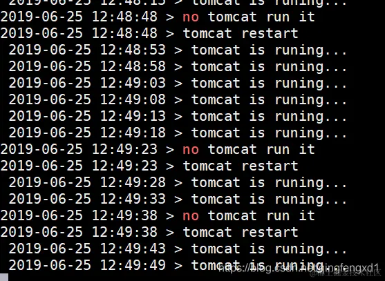 程序每隔5s就去检测tomcat服务是否存在,存在就打印相应的日志,如果不存在,就把服务重启并提示服务重启。
