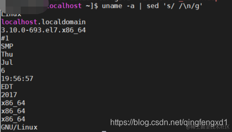 用uname -a可以看到操作系统的一些信息,用空格分割。使用sed或其他工具,把每一个信息单词分行打印出来,