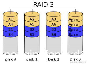 带奇偶校验码的并行传送校验磁盘阵列,这种校验码与RAID2不同,只能查错不能纠错。它访问数据时一次处理一个带区,这样可以提高读取和写入速度,它像RAID 0一样以并行的方式来存放数据,但速度没有RAID 0快。校验码在写入数据时产生并保存在另一个磁盘上。需要实现时用户必须要有三个以上的驱动器,写入速率与读出速率都很高,因为校验位比较少,因此计算时间相对而言比较少。用软件实现RAID控制将是十分困难的,控制器的实现也不是很容易。它主要用于图形(包括动画)等要求吞吐率比较高的场合。不同于RAID 2,RAID 3使用单块磁盘存放奇偶校验信息。如果一块磁盘失效,奇偶盘及其他数据盘可以重新产生数据。 如果奇偶盘失效,则不影响数据使用。RAID 3对于大量的连续数据可提供很好的传输率,但对于随机数据,奇偶盘会成为写操作的瓶颈。 利用单独的校验盘来保护数据虽然没有镜像的安全性高,但是硬盘利用率得到了很大的提高,为n-1。