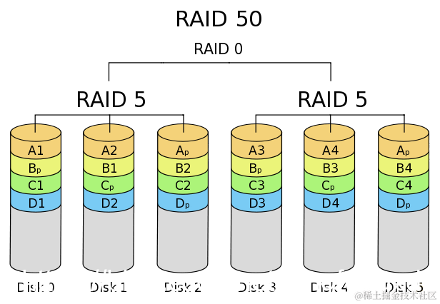 被称为分布奇偶位阵列条带。同RAID 30相仿的,它具有RAID 5和RAID 0的共同特性。它由两组RAID 5磁盘组成(每组最少3个),每一组都使用了分布式奇偶位,而两组硬盘再组建成RAID 0,实验跨磁盘抽取数据。RAID 50提供可靠的数据存储和优秀的整体性能,并支持更大的卷尺寸。即使两个物理磁盘发生故障(每个阵列中一个),数据也可以顺利恢复过来。 RAID 50最少需要6个驱动器,它最适合需要高可靠性存储、高读取速度、高数据传输性能的应用。这些应用包括事务处理和有许多用户存取小文件的办公应用程序。