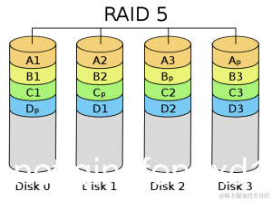 分布式奇偶校验的独立磁盘结构。从它的示意图上可以看到,它的奇偶校验码存在于所有磁盘上,其中的p0代表第0带区的奇偶校验值,其它的意思也相同。RAID5的读出效率很高,写入效率一般,块式的集体访问效率不错。因为奇偶校验码在不同的磁盘上,所以提高了可靠性,允许单个磁盘出错。RAID 5也是以数据的校验位来保证数据的安全,但它不是以单独硬盘来存放数据的校验位,而是将数据段的校验位交互存放于各个硬盘上。这样,任何一个硬盘损坏,都可以根据其它硬盘上的校验位来重建损坏的数据。硬盘的利用率为n-1。 但是它对数据传输的并行性解决不好,而且控制器的设计也相当困难。RAID 3 与RAID 5相比,重要的区别在于RAID 3每进行一次数据传输,需涉及到所有的阵列盘。而对于RAID 5来说,大部分数据传输只对一块磁盘操作,可进行并行操作。在RAID 5中有“写损失”,即每一次写操作,将产生四个实际的读/写操作,其中两次读旧的数据及奇偶信息,两次写新的数据及奇偶信息。 RAID-5的话,优点是提供了冗余性(支持一块盘掉线后仍然正常运行),磁盘空间利用率较高(N-1/N),读写速度较快(N-1倍)。RAID5最大的好处是在一块盘掉线的情况下,RAID照常工作,相对于RAID0必须每一块盘都正常才可以正常工作的状况容错性能好多了。因此RAID5是RAID级别中最常见的一个类型。