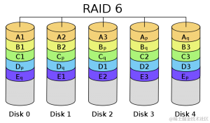 两种存储的奇偶校验码的磁盘结构。名字很长,但是如果看到图,大家立刻会明白是为什么,请注意p0代表第0带区的奇偶校验值,而pA代表数据块A的奇偶校验值。它是对RAID5的扩展,主要是用于要求数据绝对不能出错的场合。当然了,由于引入了第二种奇偶校验值,所以需要N+2个磁盘,同时对控制器的设计变得十分复杂,写入速度也不好,用于计算奇偶校验值和验证数据正确性所花费的时间比较多,造成了不必须的负载。我想除了军队没有人用得起这种东西。