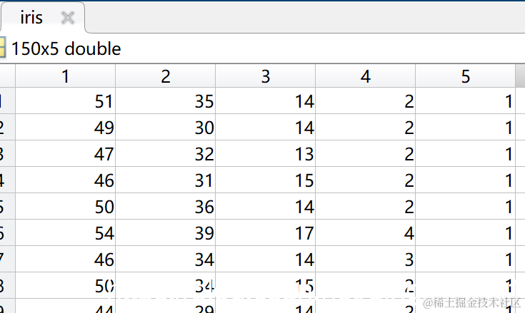 将数据集载入到工作区,部分数据集如图所示。数据集的前四列分别为与鸢尾花种类相关的4个特征值,对应上图中的花萼长度、花萼宽度、花瓣长度及花瓣宽度;第五列为鸢尾花所属种类,分为1-Setosa、2-Versicolour、3-Virginica三类。