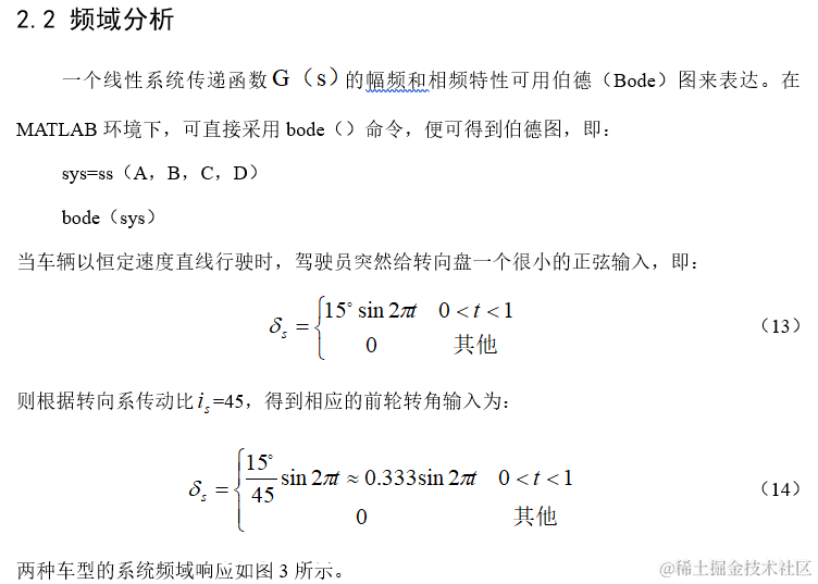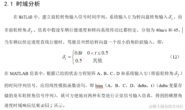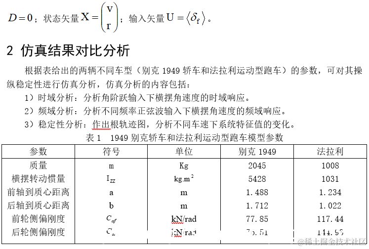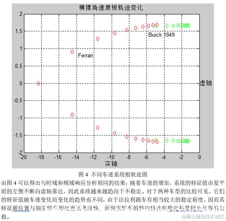 通常,随着车速的提高,车辆的行驶稳定性下降。对具有过多转向特性的车辆而言,当车速超过其极限车速时,系统将处于不稳定工况,即意味着在很小的干扰输入时,系统将产生很大的响应输出(如高速转向时车辆可能发生侧滑)。而车辆行驶的稳定性与其等效线性系统的特征值有密切的联系。