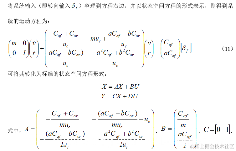 汽车以恒速行驶时,汽车只有沿y轴的侧向远动与绕z轴的横摆运动两个自由度。此外,汽车的侧向加速度限定在0.4g以内,轮胎侧偏特性处于线性范围。图1所示为一个由前后两个侧向弹性的轮胎支撑于地面、具有侧向及横摆运动的线性二自由度汽车模型,其运动方程为: