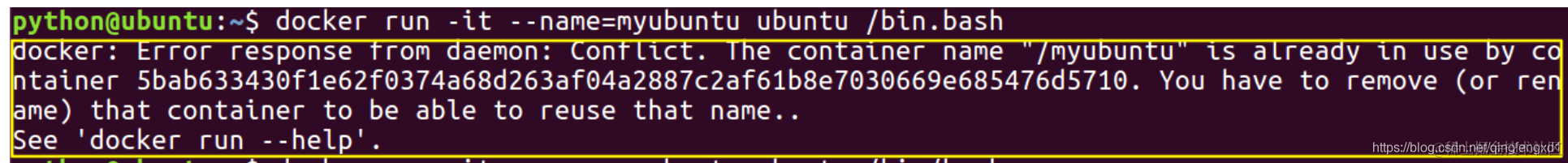 (1) 给容器换一个名字, 比如说 docker run -it --name=myubuntu2 ubuntu /bin/bash, 可以解决问题.