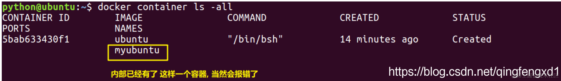 错误提示意思是, myubuntu已经被使用了, 就是本机内部已经有了一个名字为 myubuntu 容器, 我们可以用命令 sudo docker container ls 看下本机正在运⾏的容器, 果不其然: