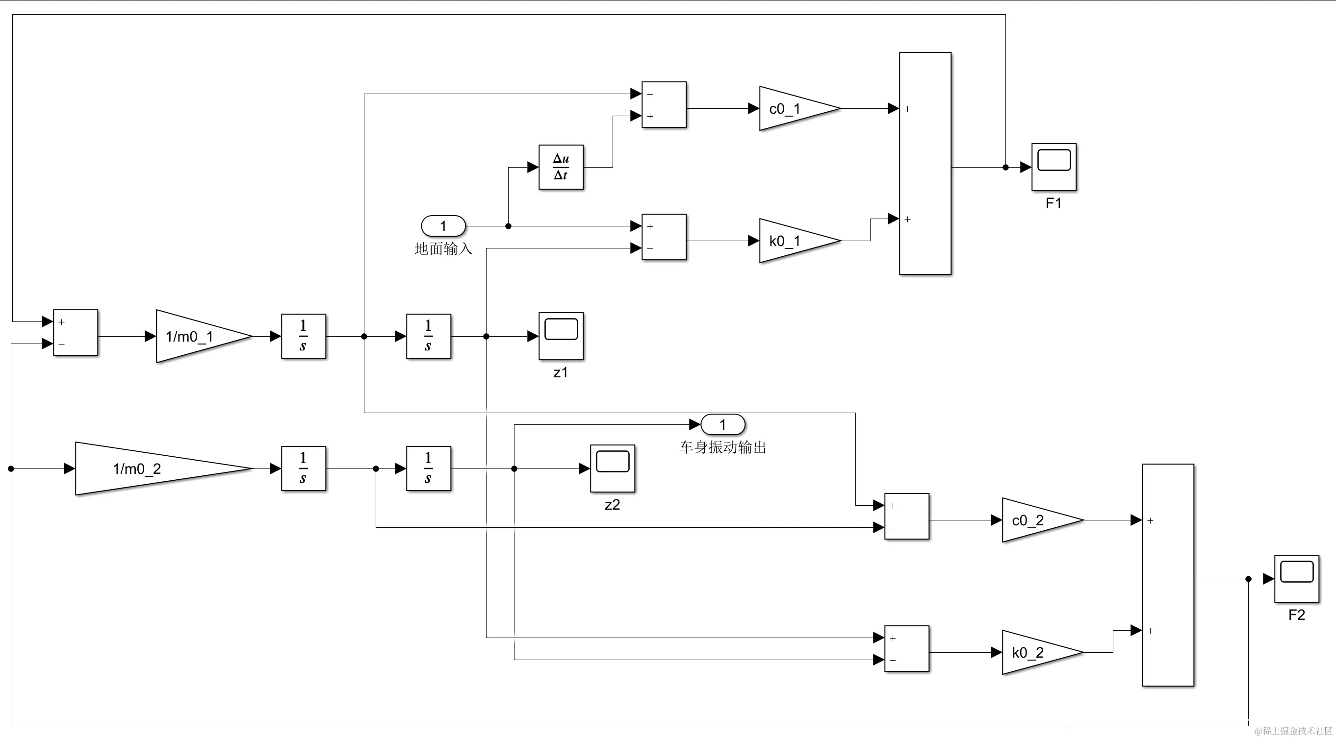 matlab simulink 四分之一1/4车辆垂向振动模型 轮毂电机 算法工程师的学习日志 2021-06-17 140 阅读1分钟 轮毂电机的引入增大了非簧载质量,根据这一特性,经过简化的含有轮毂电机的1/4车辆垂向振动模型如图所示。 由图中的车辆振动模型,可得到车辆垂向振动的动力学微分方程: Matlab/Simulink仿真 结果: