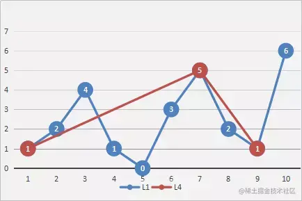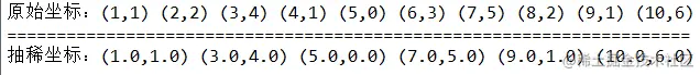 输出结果:1.0 4.0,4.0 2.0,7.0 7.0,9.0 5.0,10.0 10.0,其中2 3,6 6,8 6两个坐标被抽稀掉了。