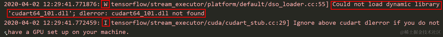 在以前的TensorFlow版本中,找不到CUDA库会发出错误并引发异常,而现在该库会从动力学上搜索正确的CUDA版本,如果找不到,则会发出警告(开头的W代表对于警告,错误以E(或F表示致命错误)并退回到仅CPU模式。实际上,警告之后,错误消息也作为信息消息写在日志中(请注意,如果警告级别更高,最低日志级别(默认值,您可能看不到信息消息)
