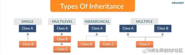 继承是指创建包含其父类的专业化的子类的能力。它进一步分为四种类型,即单继承、多级继承、分层继承和多重继承。请参考下图以获得更好的理解。